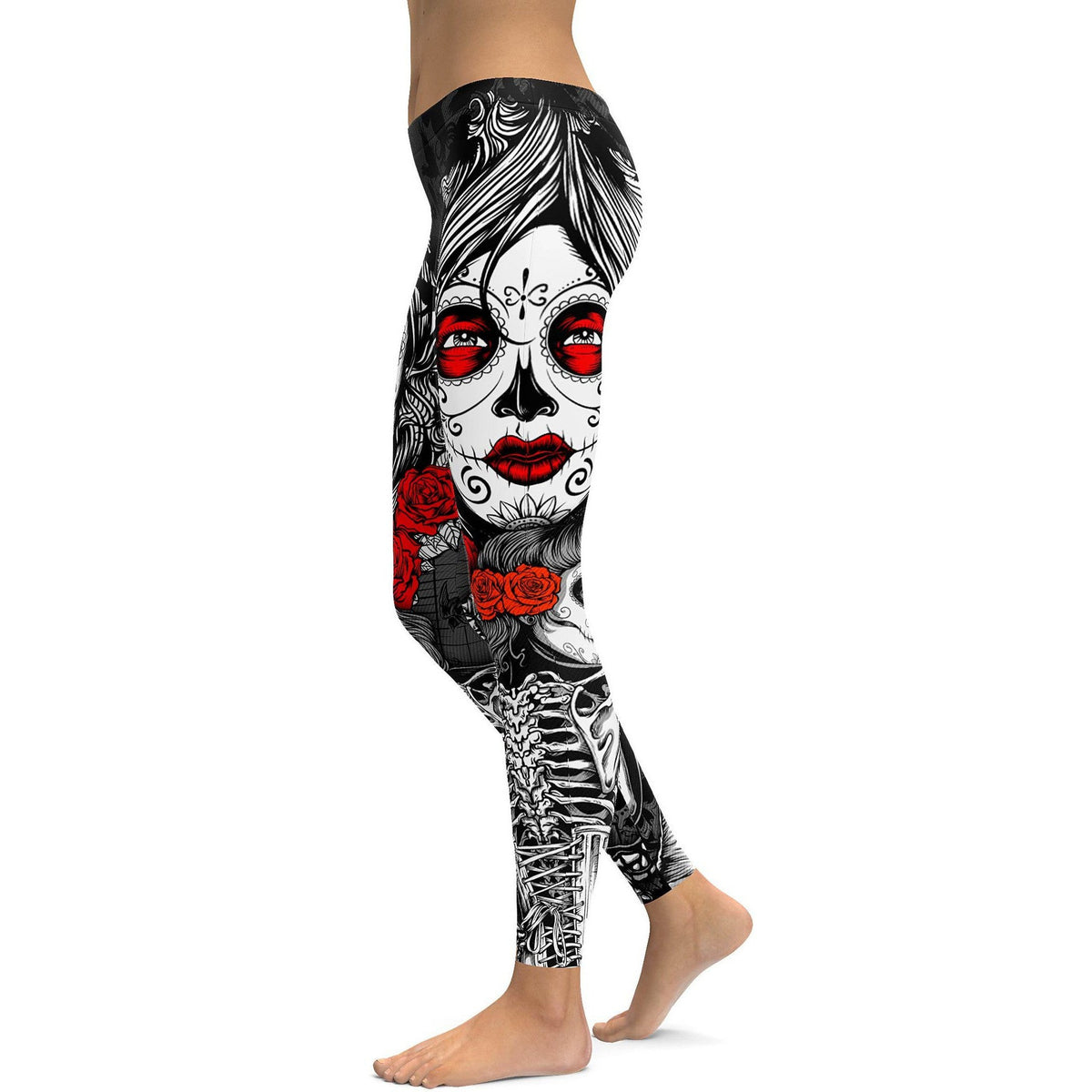 Women's skeleton sugar skull printed leggings front view