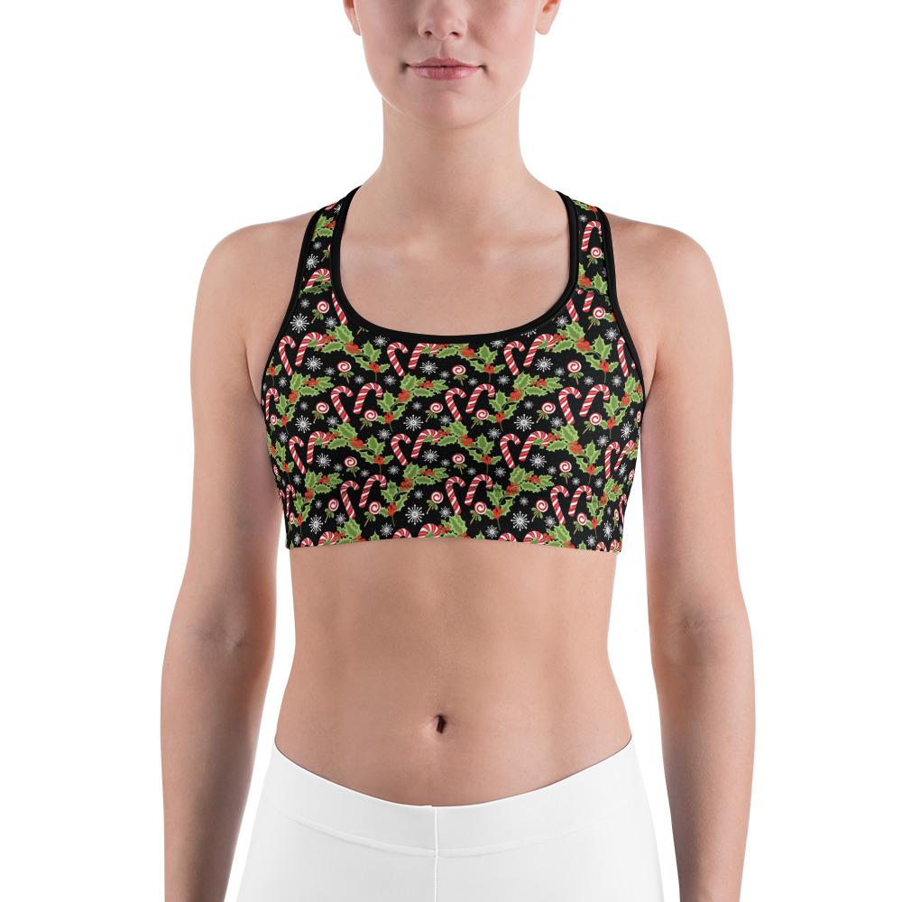 Women's holly leaves with berries printed sports bra front view