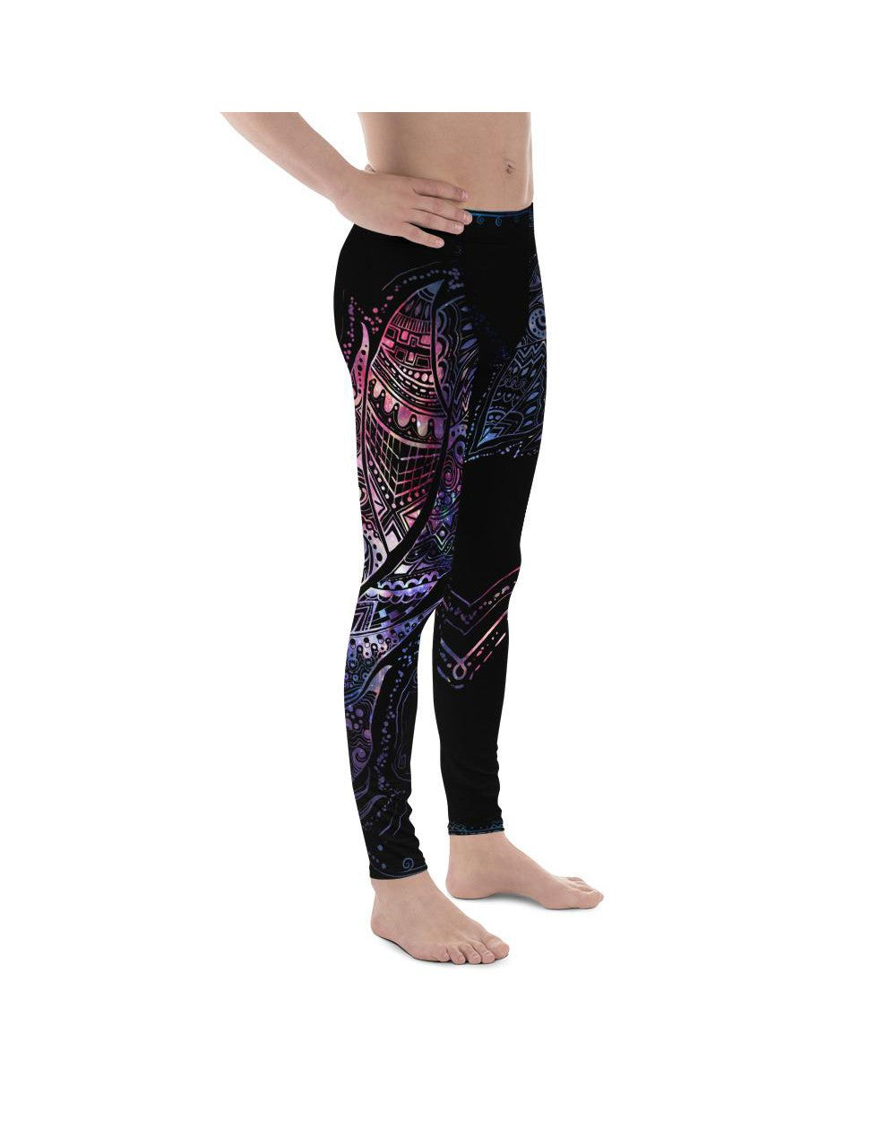 Men's multi-colored feather printed leggings front view