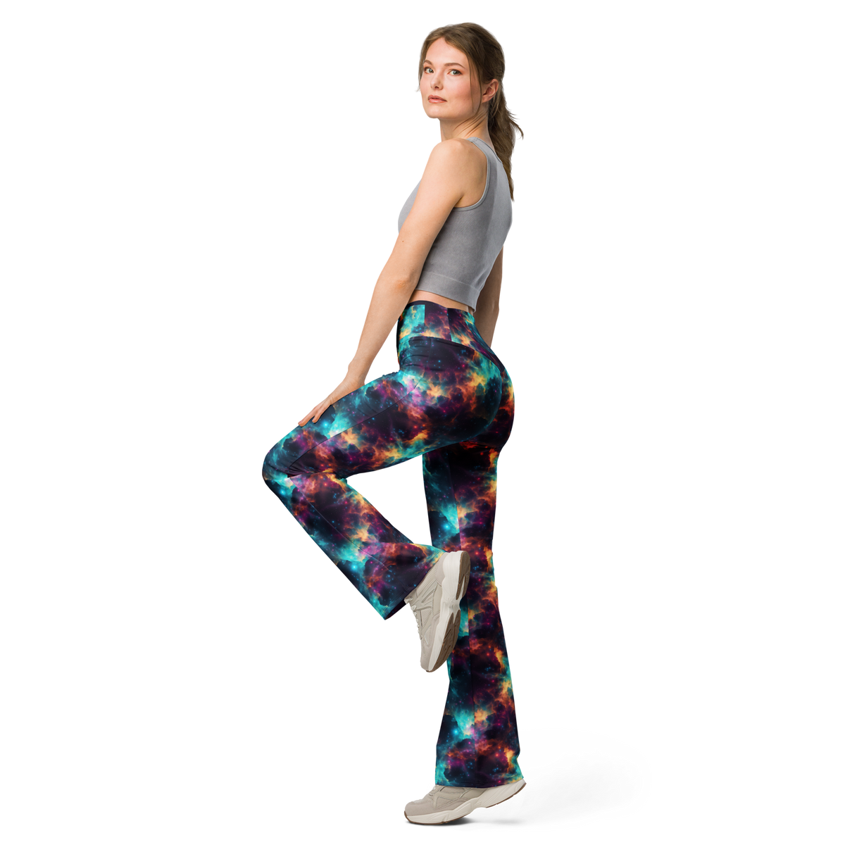 Women's nebula pattern flare leggings front view
