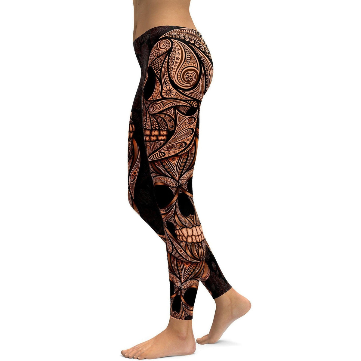 Women's orange ornamental skull printed leggings front view