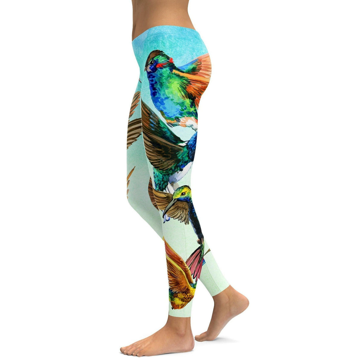 Women's watercolor hummingbird printed leggings front view