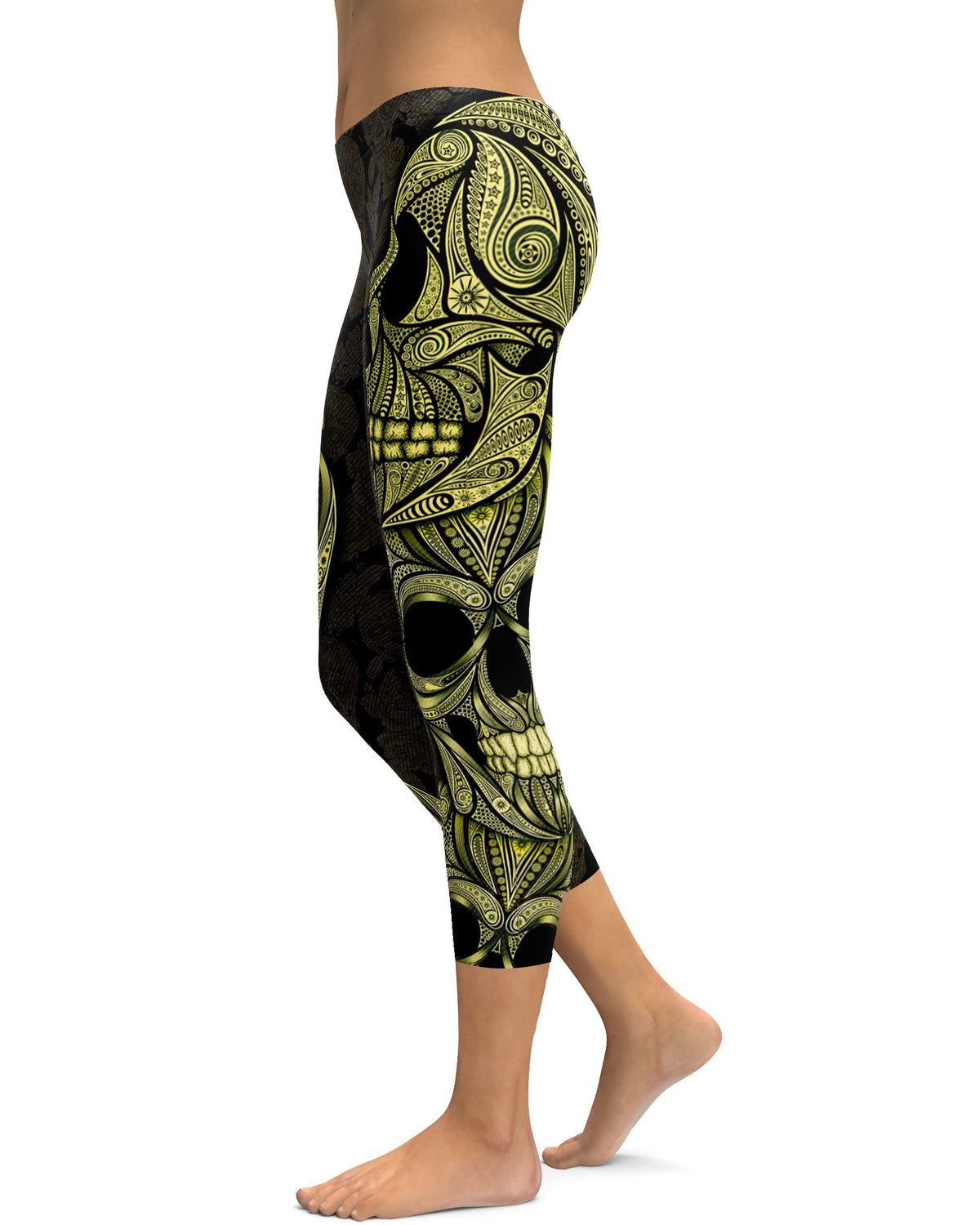 Women's yellow ornamental skull capris front view